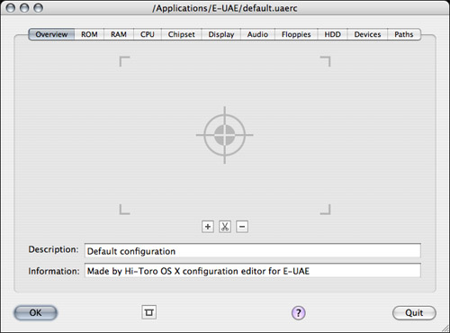 Hi-Toro is a Mac OS X configuration editor for E-UAE, the Enhanced Unix Amiga Emulator. It provides an Aqua graphical user interface for you to make, open, save, modify and launch configurations, even configurations imported from WinUAE, or other UNIX variants of the emulator.